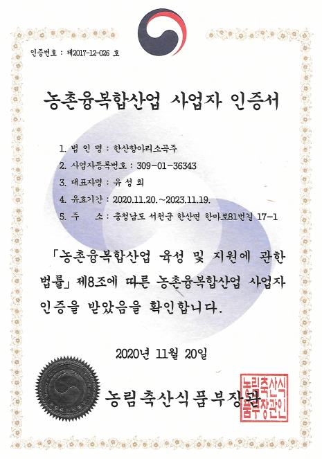 농촌융복합산업은 농업인 또는 농촌지역 거주자가 농촌지역의 농산물 · 자연 · 문화 등 유형 · 무형의 자원을 이용하여 식품가공 등 제조업, 유통 · 관광 등 서비스업 및 이와 관련된 재화 · 용역을 복합적으로 결합하여 제공함으로써 부가가치를 창출하거나 높이는 산업입니다. 저는 한산항아리 소곡주로 인증받게 되었습니다.