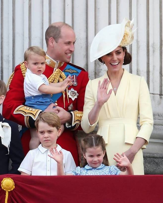5. 2019년 여왕의 생일틀 축하하는 퍼레이드 행사에 가족와 함께 참석한 샬롯 공주는 피터팬 칼라의 블루 드레스를 입고 우아한 손인사를 하고 있다.
