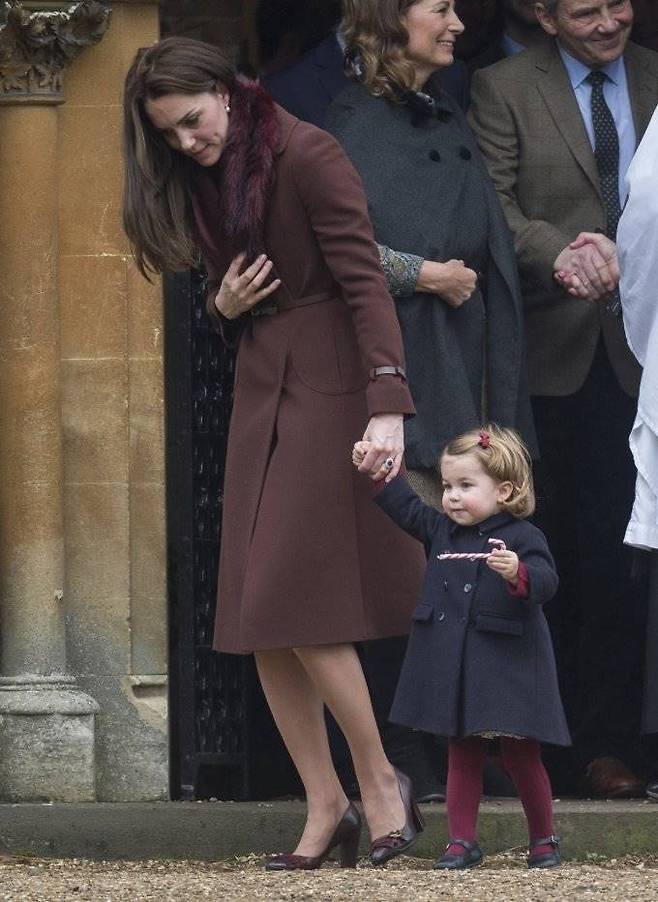 15. 2016년 성탄절 축하 예배에 참석한 샬롯 공주는 블랙 코트와 엄마가 입은 코트와 조화를 이루는 버건디 타이트를 착용했다.