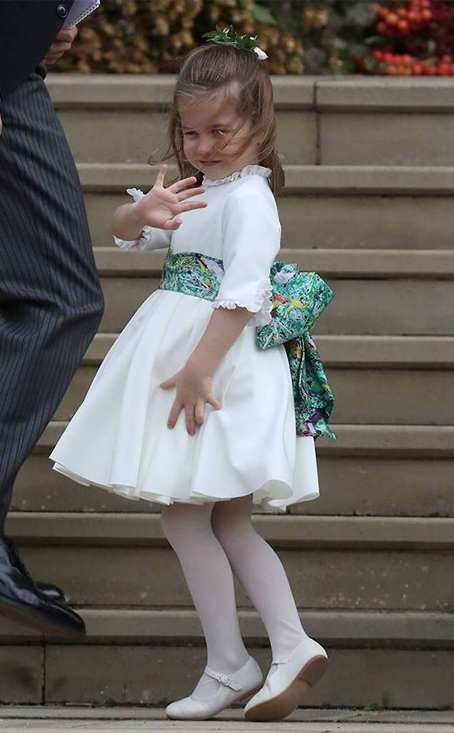 6. 2018년 유제니 공주의 결혼식에 참석한 샬롯 공주는 화려한 벨트 디테일이 돋보이는 새련된 화이트 드레스를 입었다.