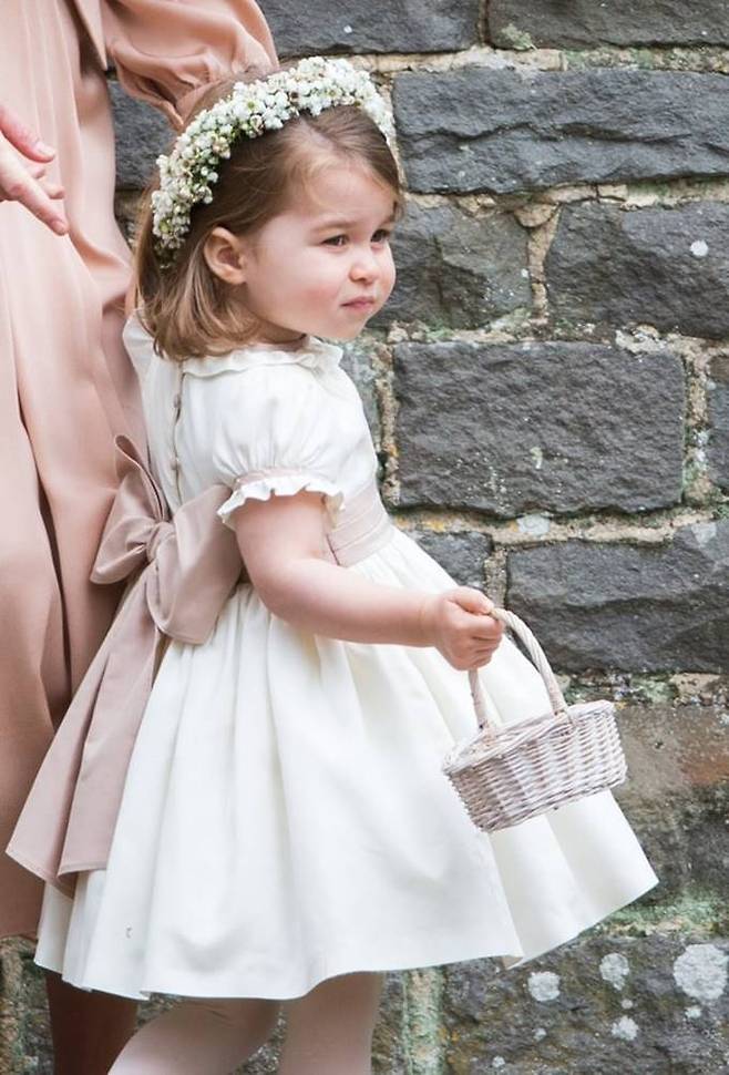 12. 2017년 이모인 피파 미들턴의 결혼식에서 샬롯 공주는 리틀 화이트 드레스에 화관을 썼다.