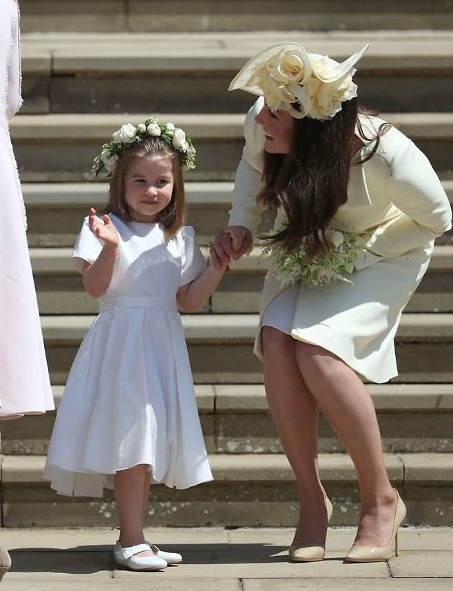 9. 2018년 삼촌 해리 왕자와 메건 마클의 결혼식에 참석한 샬롯 공주는 화관과 화이트 드레스를 입고 신부 들러리와 시동으로 활약했다.