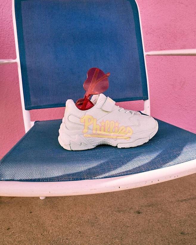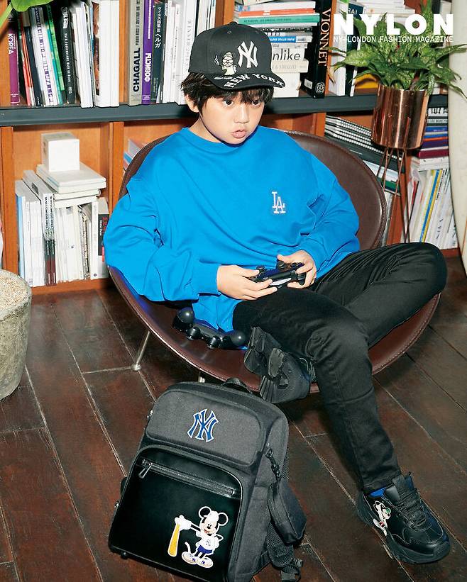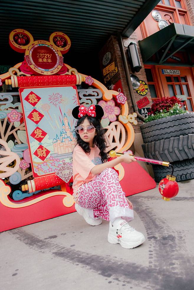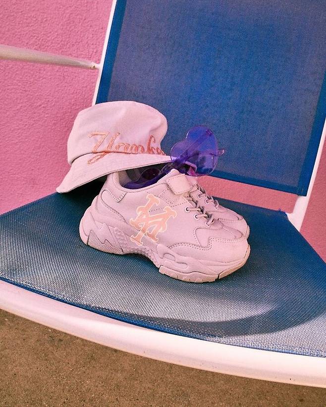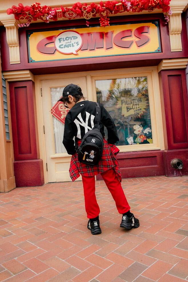 미키 자수가 놓인 볼캡을 맞춰 쓰거나