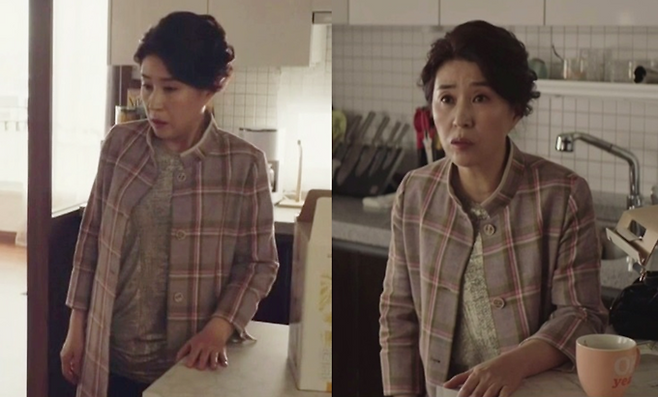 ↑사진 = 김미경이 착용한 ‘올리비아 하슬러’ 린넨 체크 재킷