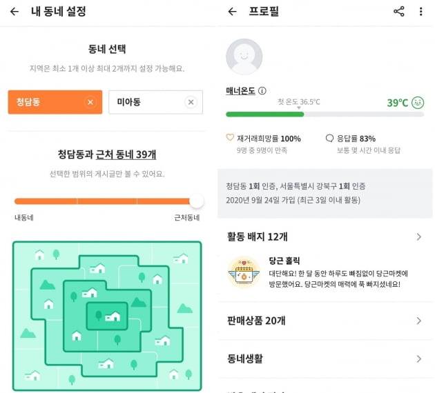 거래지역도 설정했습니다. 당근마켓에선 최대 두군데까지 거래할 지역을 정할 수 있습니다. 대부분의 사람들이 거주하는 곳과 직장이 가까운 곳 두 곳을 지정한다고 합니다. 저는 지역별 특성을 분석해보고자 강남과 강북 각각 한 곳씩을 꼽았습니다. 강북구 미아동와 강남구 청담동입니다. 각각은 상대적으로 중저가 주택이 많은 외곽 지역과 대한민국에서 가장 비싼 아파트가 즐비한 부촌입니다. 지역 설정을 하려면 현재 위치를 인증해야합니다. 거래를 할 때 마다 두 곳을 왔다갔다하며 틈틈이 ‘내 동네 인증’도 했습니다.
