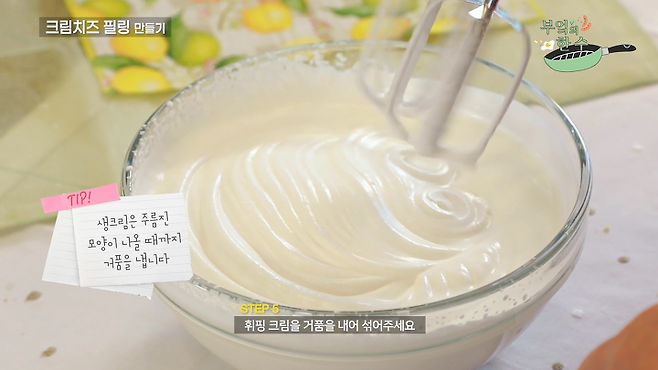 5. 생크림 500g을 거품기로 충분히 거품을 내주세요