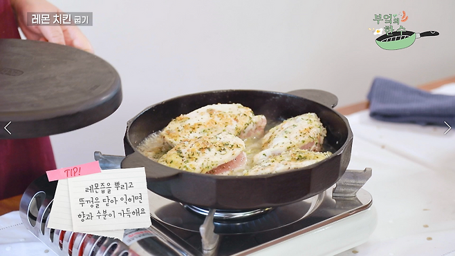 8. 닭가슴살을 뒤집고 레몬즙을 뿌린 후 펜 뚜껑을 덮어주고 5~6분 익혀줍니다