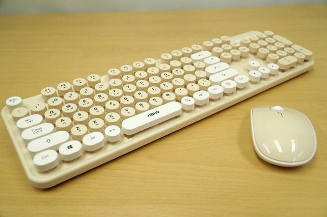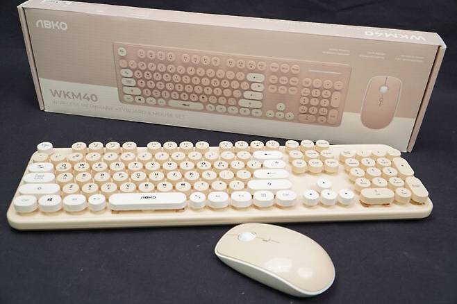 둥근 자판의 레트로스타일 키캡과 베이지 및 아이보리 색상을 활용한 무선 키보드마우스, ABKO WKM40 이다.