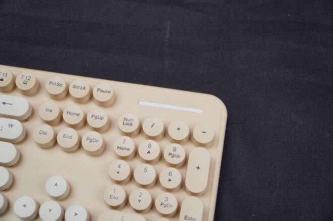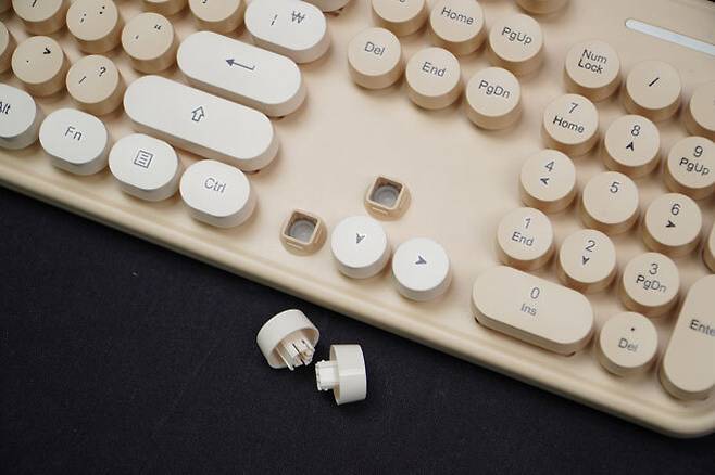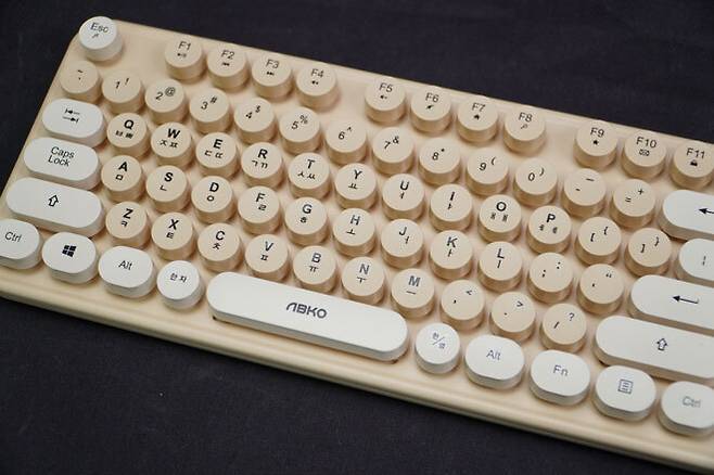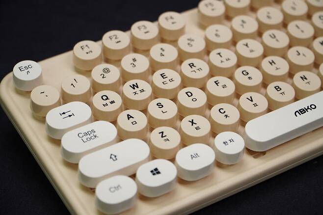 옛날에 쓰던 타자기의 원형 버튼을 본따 만든 원형 키캡으로 꾸며져있기 때문이다. 네모난 키캡만 보다가 원형의 키캡만으로도 단순 키보드가 다른느낌을 주는 모습이다.
