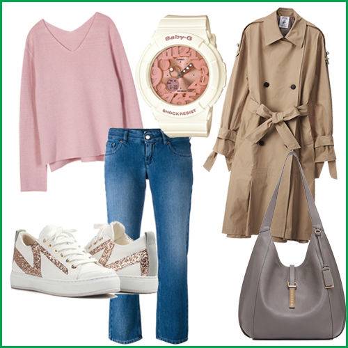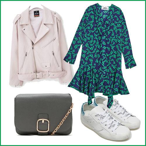 패턴&프릴 원피스와 베이비핑크 라이더 자켓