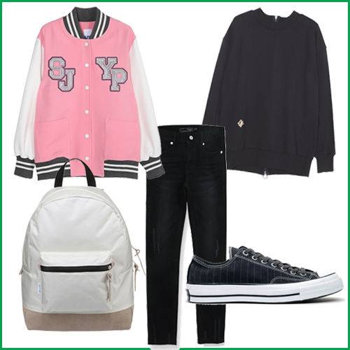 핑쿠핑쿠 스타디움 자켓에 화이트 백팩을 플러스