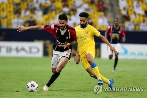 epa09216319 Al-Nassr's player Abdulrahman Al-Obaid (R) in action against Al-Raed's Abdullah Al-Mogren (L) during the Saudi Professional League soccer match between Al-Nassr and Al-Raed at ?Mrsool Park Stadium, in Riyadh, Saudi Arabia, 20 May 2021. EPA/STRINGER