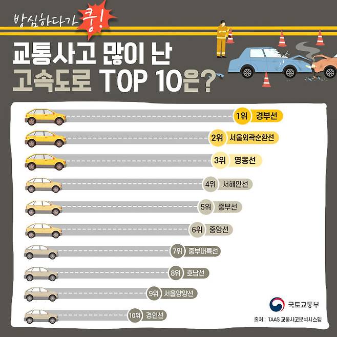 우리나라 고속도로 중에 교통사고가 많이 발생하는 곳은 어디인지 평소에 궁금하지 않으셨나요? 또한, 고속도로에서도 어느 구간에서 사고가 제일 많이 날까요? 고속도로 교통사고 발생 순위를 살펴보며 고속도로 교통사고 발생 시 안전한 대처법에 대해서 함께 알아보아요!