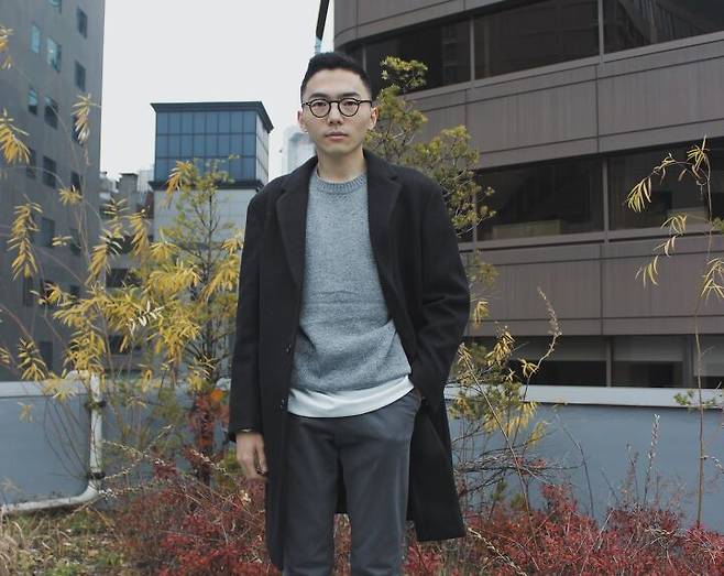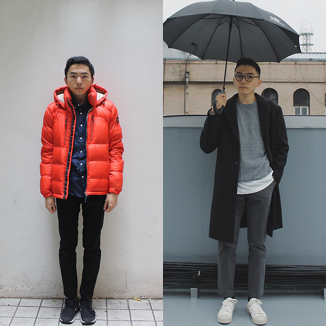 아우터는 울(wool) 소재의 검은색 코트로 코디했다. 상의는 회색 니트(knit), 하의는 먹색 치노 팬츠(chino pants)로 상의와 톤 온 톤(tone-on-tone)으로 매치했다. 니트 안에 흰색 티셔츠를 레이어링(layering, 겹쳐입기) 해 심심할 수 있는 스타일링에 포인트를 줬다. 슈즈는 하얀색 캔버스 소재 스니커즈(sneakers)를 매치해 티셔츠와 통일감을 줘 자연스럽게 연출했다.
