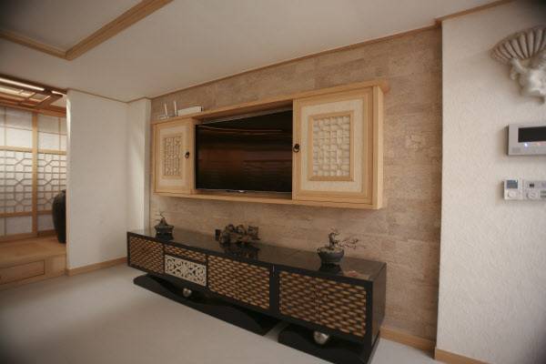 아파트에서 거실이 가장 큰 공간을 차지하는 만큼 한옥식으로 꾸밀 요소도 많다. 우선 거실창에 한식 창호를 달고, 베란다에는 바닥에서 단을 올린 툇마루를 만든다. 이 툇마루는 전통 한옥에서도 볼 수 있는 공간인데, 가족이나 지인과 간단한 다과를 즐길 수 있는 데다 하단에 서랍을 달면 수납공간 활용도 가능해 여러모로 쓸모가 있다. TV 등 현대식 가전은 나무로 짠 장에 넣어 가리면 좀 더 한옥 같은 분위기를 낼 수 있다.