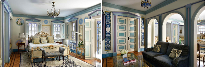 그나마 눈이 덜 아픈 이곳은 아주르 스위트룸이다. 킹사이즈 침대와 2개의 풀 사이즈 침대가 있어 4인까지 숙박이 가능하다. 소파 공간이 따로 마련되어 있어 편안히 휴식을 즐길 수 있다. 이탈리아 대리석으로 완성한 욕실은 비데와 특대형 맞춤 샤워 시설을 갖추고 있다.