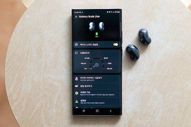 음질은 전반적으로 균형감 있다. 저음부와 고음부를 안정적으로 쏘아준다. AKG가 튜닝한 12mm 스피커가 적용됐으며, 이는 전작인 ‘갤럭시 버즈 플러스’에 탑재된 것보다 크다. 또 베이스 덕트가 가슴이 웅장해지는 저음을 제공한다. 에어팟 프로처럼 공기가 순환될 수 있는 에어 벤트를 적용해 갑갑한 느낌 없이 자연스러운 사운드를 전달한다. 스마트폰 앱과 연동을 통해 이퀄라이저(EQ)를 입맛에 맞게 바꿀 수 있는 점도 장점이다.
