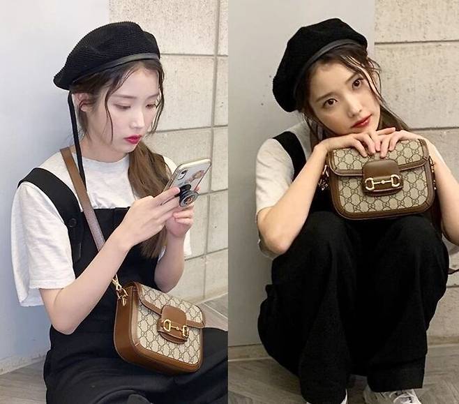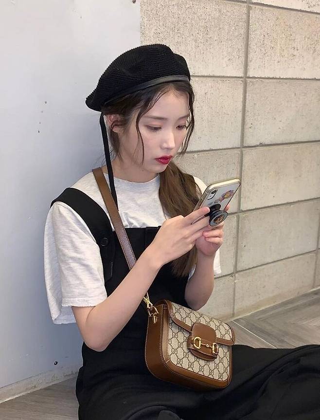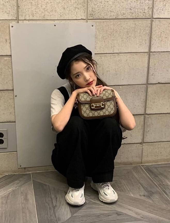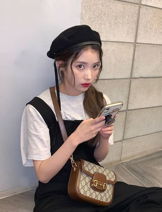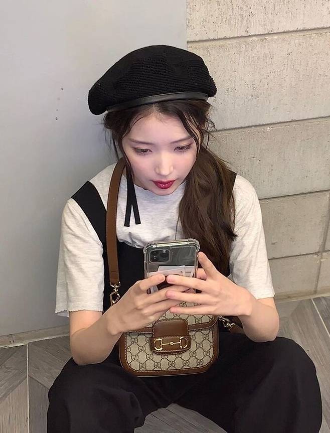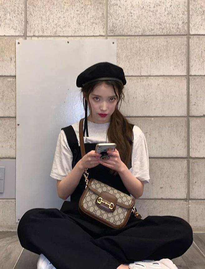 공개된 사진에서 아이유는 화이트 반팔 티셔츠에 블랙 점프슈트를 착용하고, 베레모에 미니 명품 핸드백을 걸친 깜찍한 스타일을 선보였다.