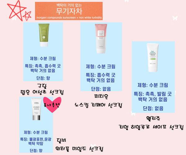 유기자차와 무기자차 제품들