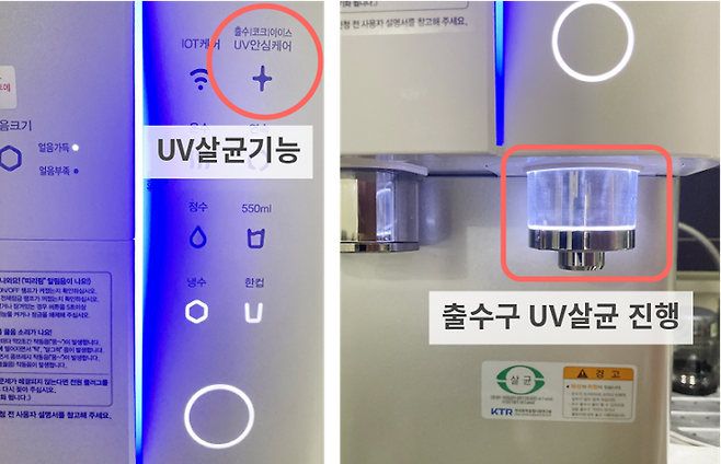 특히 출수구(코크)에는 물이 맺혀있는 상태로 외부로 노출되고, 저수조와 아이스 룸이 있는 제품도 물이나 얼음이 공기 중에 노출되기 때문에 해당 위치에 UV 램프가 있는 것이 좋습니다.
