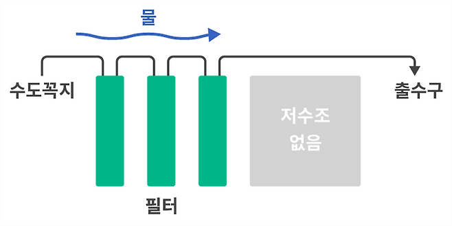 대신 한 번에 많은 양의 물이 배출되지는 않습니다. 수돗물이 아닌 지하수를 사용하거나 배관의 노후화 정도가 심한 경우 정수 시간이 오래 걸리기 때문에 적합하지 않습니다. (이런 경우에는 저수조형을 사용하는 것이 좋습니다.)