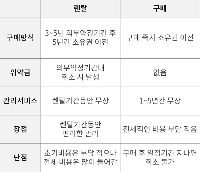 초기 비용에 부담이 있거나 단기간 사용한다면 렌털이 유리하고, 같은 기간 사용한다면 직접 구매가 10~30% 저렴합니다.
