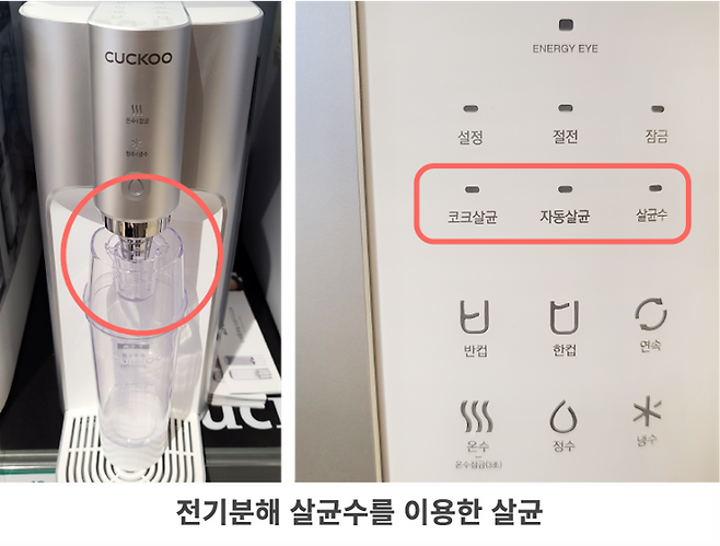 살균수 기능을 작동시키면, 필터가 아닌 전기분해 장치를 거친 살균수(차아염소산수)가 직수관을 흐르면서 내부를 세척 후 배출되어 위생관리에 도움을 줄 수 있습니다.