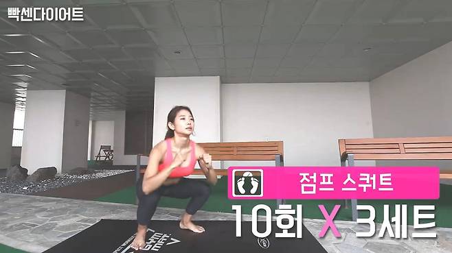 점프를 했다가 다시 스쿼트 자세를 취합니다.