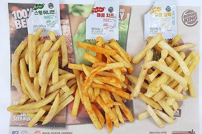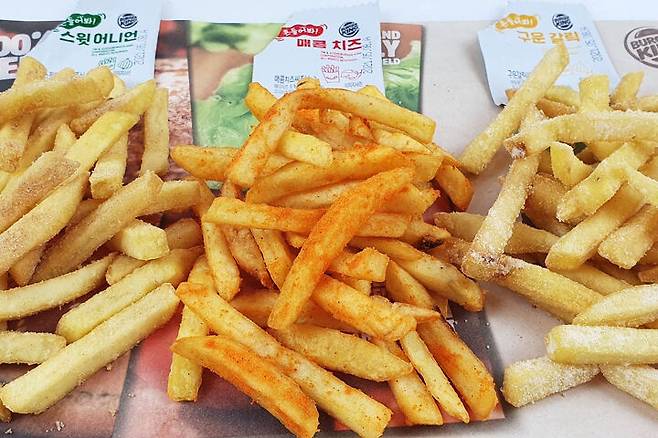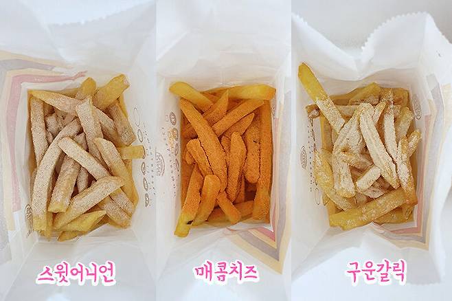 감자튀김과 시즈닝 한 개가 세트! 세 가지 맛이 쪼르륵 있으니 든든하네요.ㅎㅎ