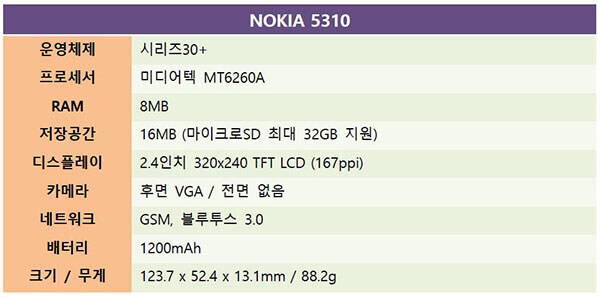 노키아는 피처폰이 대세이던 시절 선보였던 모델 가운데 인기가 높았던 제품들을 새롭게 해석해 다시 내놓기를 반복하고 있다. 재작년 국내에도 출시되었던 노키아 8110 4G, 일명 바나나폰도 1996년 출시했던 노키아 8110을 리뉴얼한 모델이었다. 노키아 5310 역시 2007년 출시했던 휴대전화로, 당시에는 노키아 5310 익스프레스뮤직(XpressMusic)이라는 이름으로 선보였었다.