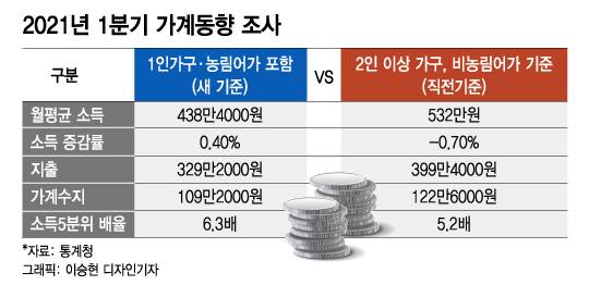통계청은 이번 가계동향조사 부터 1인가구 농림어가 포함 기준으로 통계공표 기준을 확대했다. 1인가구 비중이 30%를 초과하는 만큼 통계에 반영해야한다는 이유에서다.