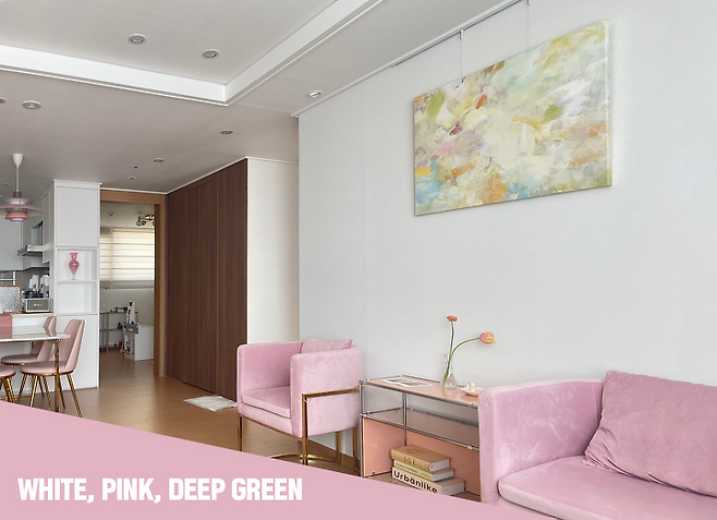 아마 저의 인테리어 취향도 그때 만들어진 것인지 지금도 저는 핑크 색을 참 좋아한답니다. 저희 집 인테리어의 핵심 컬러도 바로 핑크이기도 하고요. 그 외에는 저희 집 핵심 컬러는 바로 화이트와 딥그린입니다. 하지만 딥그린은 다소 색상이 어두운 편이라서 안방을 제외한 부분에는 사용하지 않았어요.