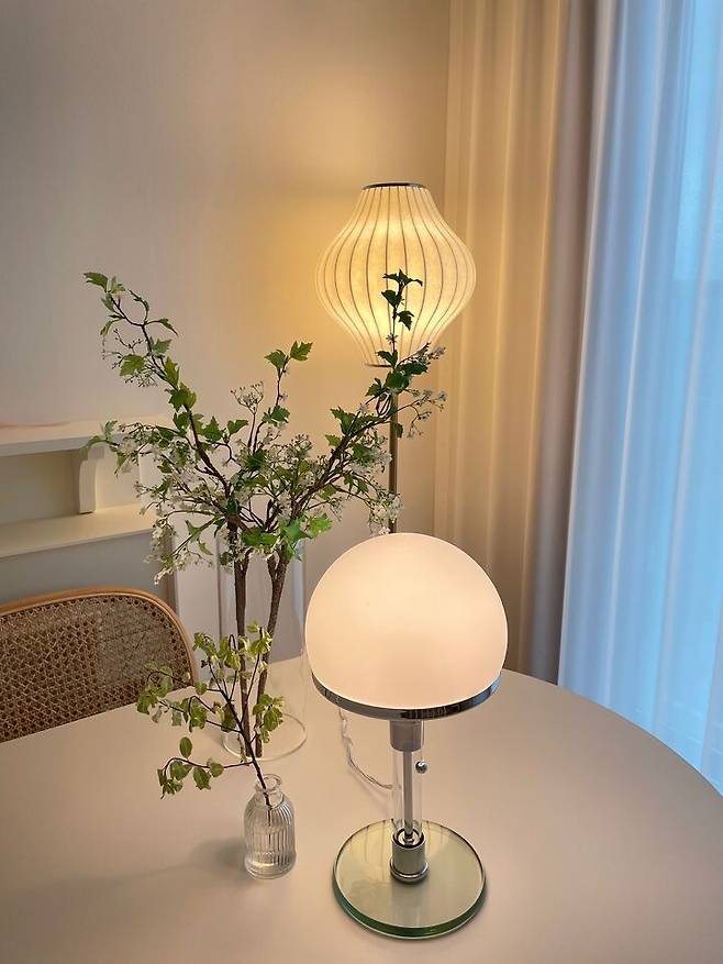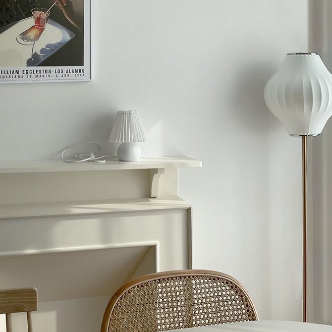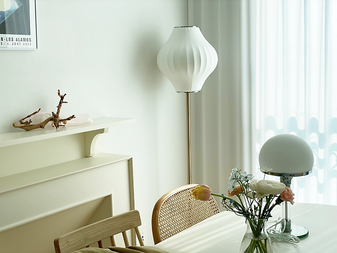 이 방의 포인트 색상은 화이트, 우드입니다. 좋아하는 스타일의 조명도 듬뿍 넣어 어둠이 내리는 밤, 비 오는 날에 더욱 로맨틱해져요!