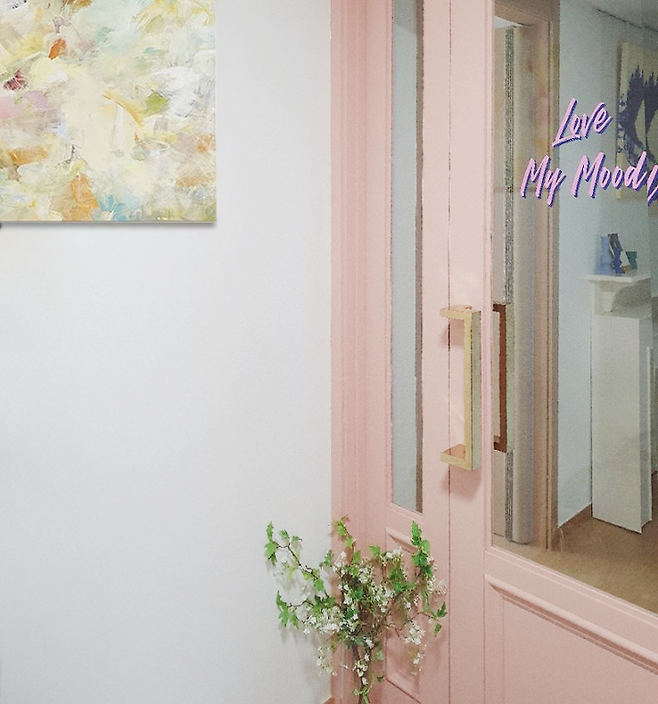 중문에도 거실의 메인 컬러인 베이비핑크 색이 쓰였습니다. 중문에는 LOVE MY MOOD라는 제 SNS ID이자, 제가 좋아하는 문구를 붙여 놓았습니다.