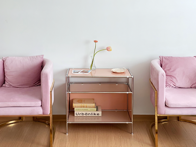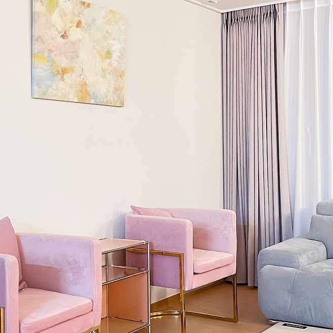 거실은 독립된 갤러리 같은, 거실 그 자체가 오브제가 되길 생각하며 꾸몄습니다. 사람들이 많이 사용하지 않는 컬러들로 꾸며졌지만, 그로 인해 오히려 더 빛을 발하게 된 공간이라고 생각해요. 실제로 보면 생각보다 핑크가 난잡스럽거나 촌스럽지 않거든요. 제 친구들이 보고, 깜짝 놀랬던 공간이기도 해요.