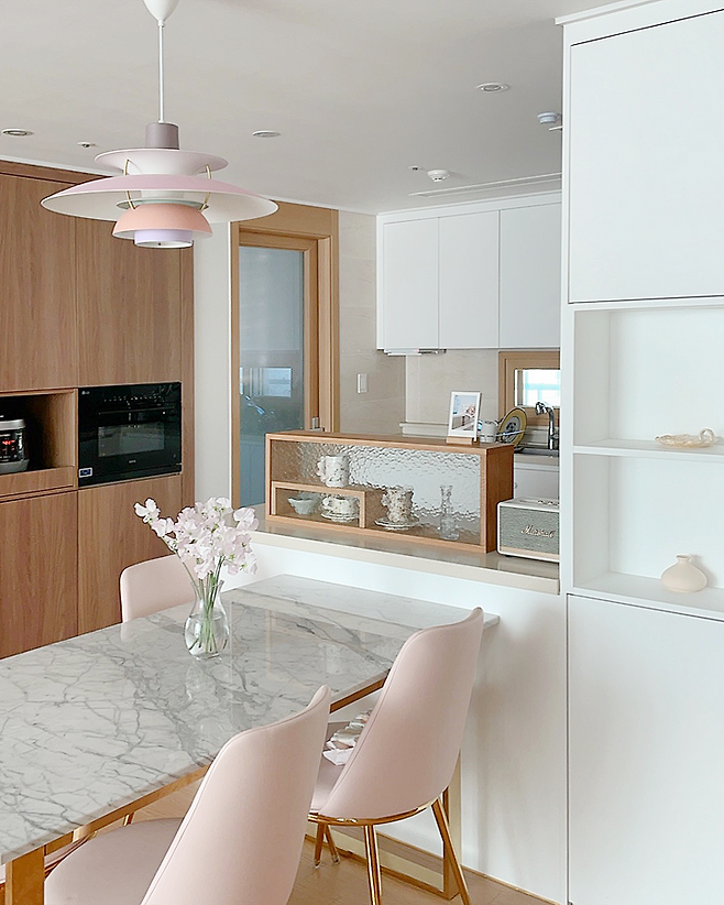 부엌 역시 거실과 통일감을 위해 베이비핑크 색상으로 꾸몄고요. 조명, 식탁 의자 등에 컬러가 사용되었습니다. 처음에는 남편이 거부감을 느껴 했는데, 지금은 오히려 이게 우리집의 특색이라며 좋아하더라고요.