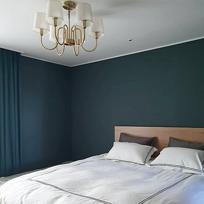 안방을 호텔처럼 편안히 수면을 취하자라는 생각으로, 벽지, 커텐을 딥그린 색상으로 선택했습니다. 딥그린 색상이 골드와 고급스럽게 어울리더라고요. 그래서 조명은 골드 컬러의 제품으로 선택했습니다.