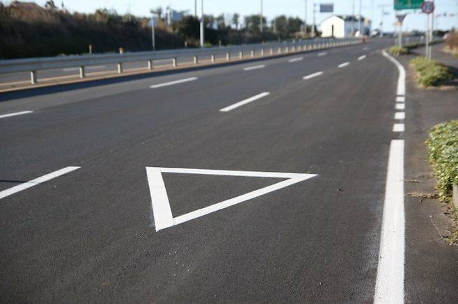 도로 위 그려진 역삼각형 표시! 이 표시는 주로 도로끝이 없어지는 합류차선에서 자주 볼 수 있는데요.