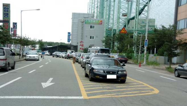 이 표시의 의미는 바로 '주정차금지'로 교차로나 소방시설 앞에 주로 그려져 있는데요. 이 표시가 있음으로써 교차로에서 빈번하게 일어나는 꼬리물기 현상을 방지할 수 있습니다.