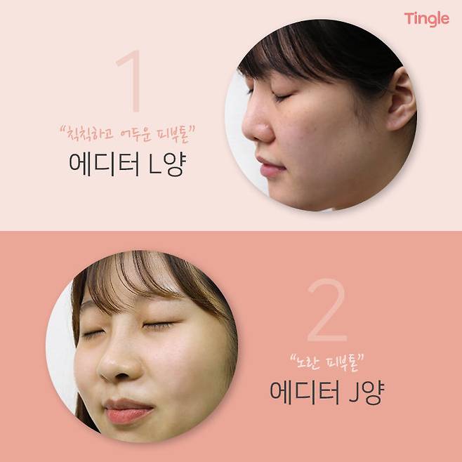 얼굴 전체적으로 칙칙하고 어두운 피부 톤을 가진 에디터 L양, 그리고 노란 피부톤을 가진 에디터 J양이에요.
