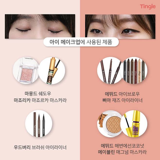 다음은 아이 메이크업인데요, L양은 밝아진 피부 톤에 어울리는 핑크 쉐도우를 바른 뒤 블랙 아이라이너와 마스카라를 이용해 또렷하고 인형 같은 눈매를 완성했어요.