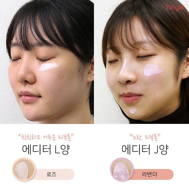 칙칙하고 어두운 피부톤의 L양은 로즈 컬러를, 노란 피부톤의 J양은 라벤더 컬러를 사용해 피부톤을 밝혀줄 거에요!