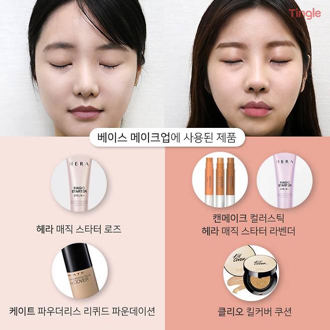 본인 톤에 맞는 베이스 제품을 선택하는 것이 얼마나 중요한지 새삼 깨닫게 되는데요. 은은하게 빛나는 피부 표현 때문인지 색조 메이크업이 더욱 환하게 빛을 발하는 모습이에요. 두 에디터 모두 처음과 180도 달라졌죠!