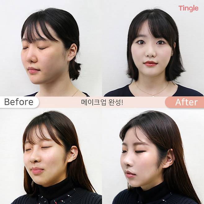 L양은 코와 입 주변, 눈 밑 다크서클의 칙칙한 부분이 확실히 커버되어 피부톤이 전체적으로 균일하게 환해졌고, J양은 피부의 노란기를 잡아주어 톤이 눈에 띄게 밝고 화사해졌어요.