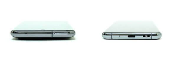 상단부에는 전작과 마찬가지로 마이크와 마이크로SD 슬롯이 마련되어 있다. 다만 인덕션 카메라가 탑재되면서 측면에서 봤을 때, 후면 카메라의 '카툭튀'가 굉장히 도드라진다. 보호 케이스를 장착하지 않은 상태에서 스마트폰을 내려놓으면, 후면 카메라가 위치해있는 우측 상단이 살짝 들뜰 정도로 말이다. 그래도 카메라 모듈부만 돌출되어 있어 아이폰11처럼 '2단 카툭튀'는 없다. 계속해서 하단부를 살펴보면 하단부에도 바뀐 것이 거의 없다. 3.5mm 이어폰 단자가 없어진 대신 우측에 있던 마이크가 좌측으로 이동되었고, 스피커 홀이 다섯 개에서 여섯 개로 늘어났다는 정도다.