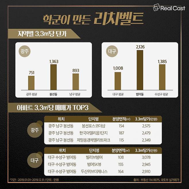 광주 부촌 봉선동과 대구 부촌 범어동은 생활 인프라가 탄탄하고 수익성이 높은 데다 무엇보다 학군이 훌륭해 토박이 부자들이 선호하는 곳으로 유명합니다.