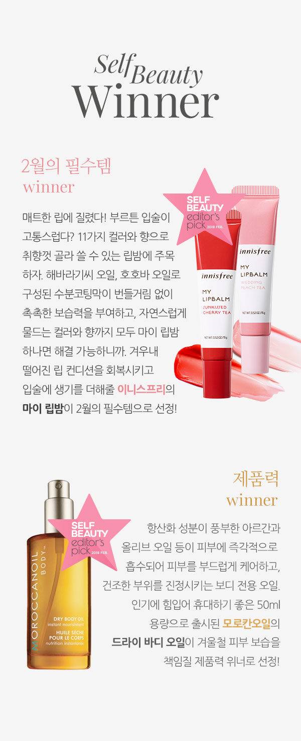 1. 취향대로 향과 컬러를 골라 쓸 수 있도록 11가지 종류로 출시된 립밤. 입술 온도에 따라 컬러가 자연스럽게 물들고, 기분이 좋아지는 TEA향과 촉촉한 보습을 선사하는 이니스프리의 마이 립밤 8호 썬키스드 체리티 15g 10,000원.