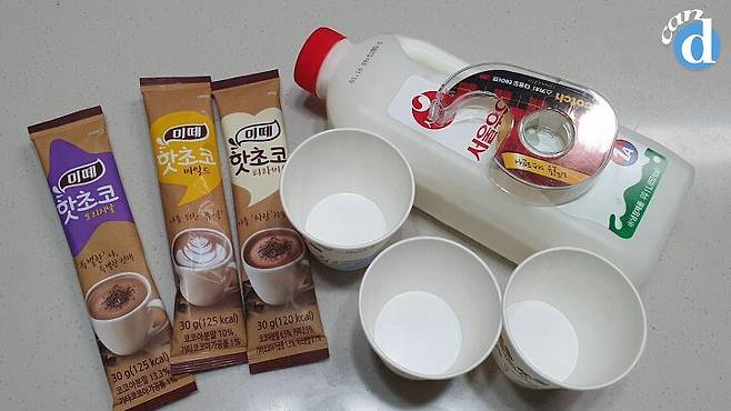준비물 : 미떼, 종이컵, 우유(물로 대체 가능), 테이프