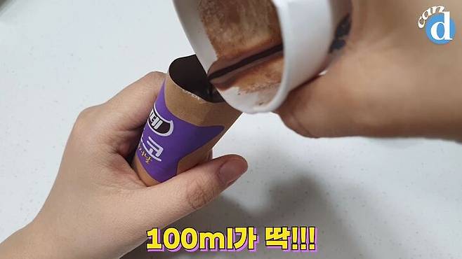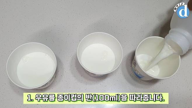 먼저 종이컵에 우유를 따라줍니다.