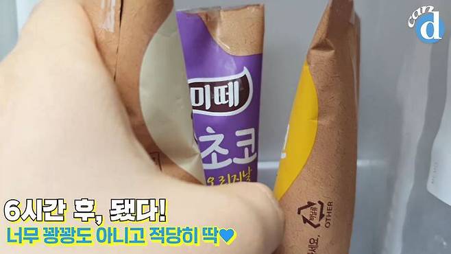 미떼 섞인 우유를 스틱에 부어주고 얼리면 끝!